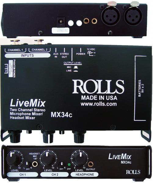 The MX34c LiveMix - two channel microphone mixer. Although having many uses, this little mixer was originally designed with the video camera operator in mind. The MX34c is a two channel microphone mixer with balanced XLR inputs, phantom power, and stereo 1/8" (3.5mm) outputs.
