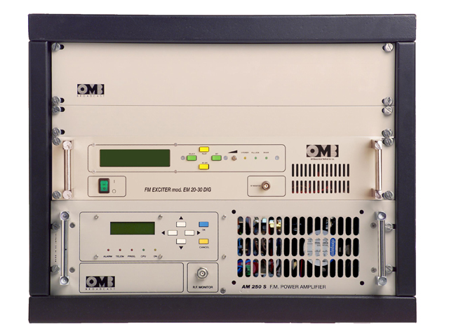 The EM 250 is a 250W FM transmitter made up of the EM 25 DIG PLUS or EM20/30 exciter and the AM 250 FM amplifier. This equipment includes a high-efficiency amplifier, LPF (Low Pass Filter) and cyclical protections of: SWR, overdrive, over-consumption, over-power and temperature. The output power is externally adjustable between 0 and 250W.The EM 250 also incorporates a switching power supply that allows stable output power with input voltage from 90 to 260VAC.