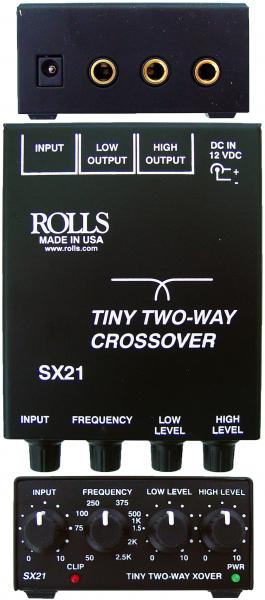 The SX21 is a 24dB/Octave two-way frequency divider intended for small sound reinforcement applications. It has Input, Low and High Output jacks, and Input, Crossover Frequency, Low and High Output controls. It is powered by an included 12 to 16 volt DC adapter.
